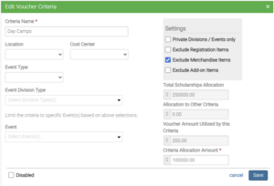Voucher criteria define how voucher funds are allocated by setting rules for eligible events and applicable charges, ensuring scholarship funds are applied only where intended.